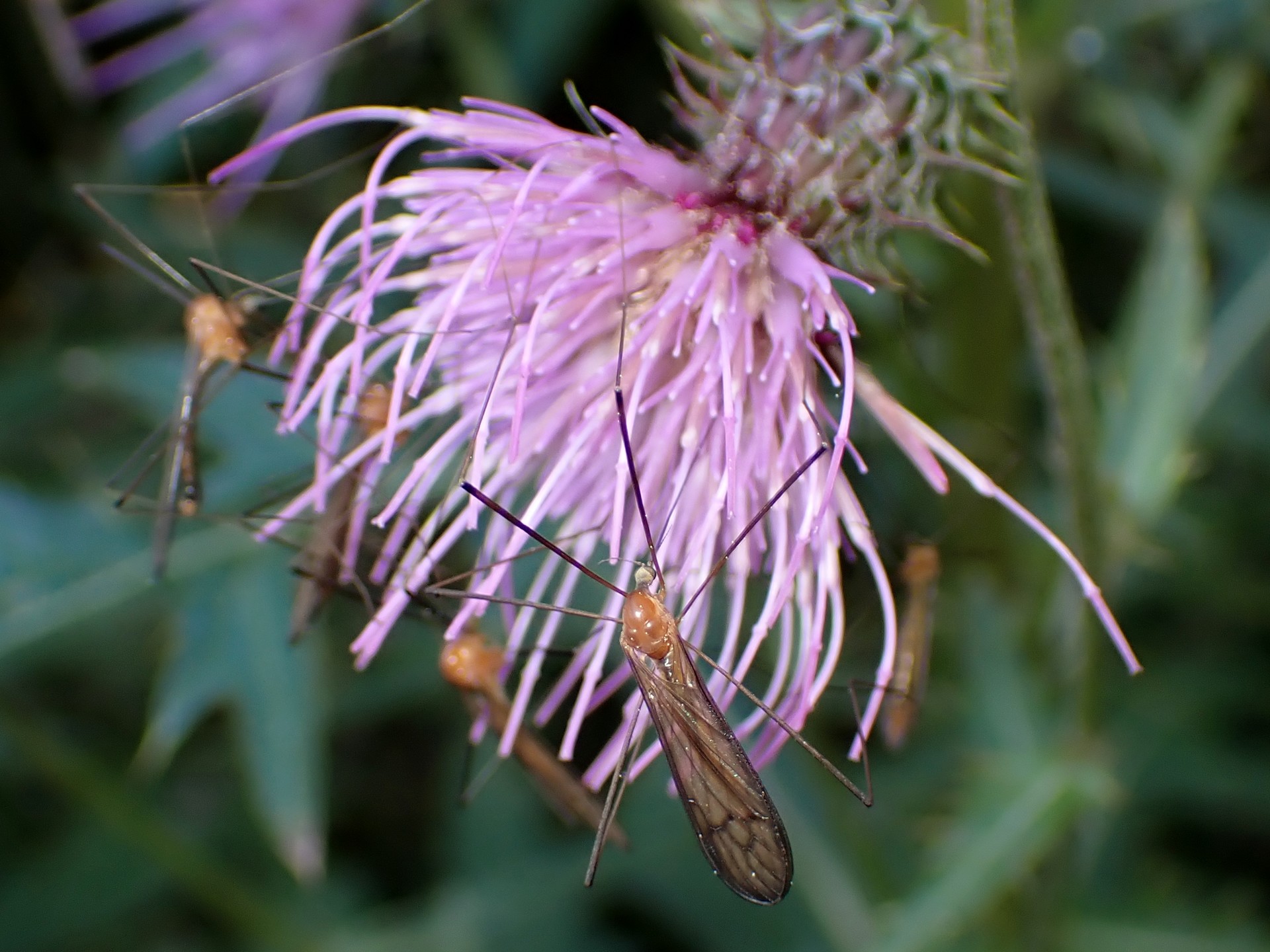 ガガンボの集団がアザミの蜜を吸っているところです。