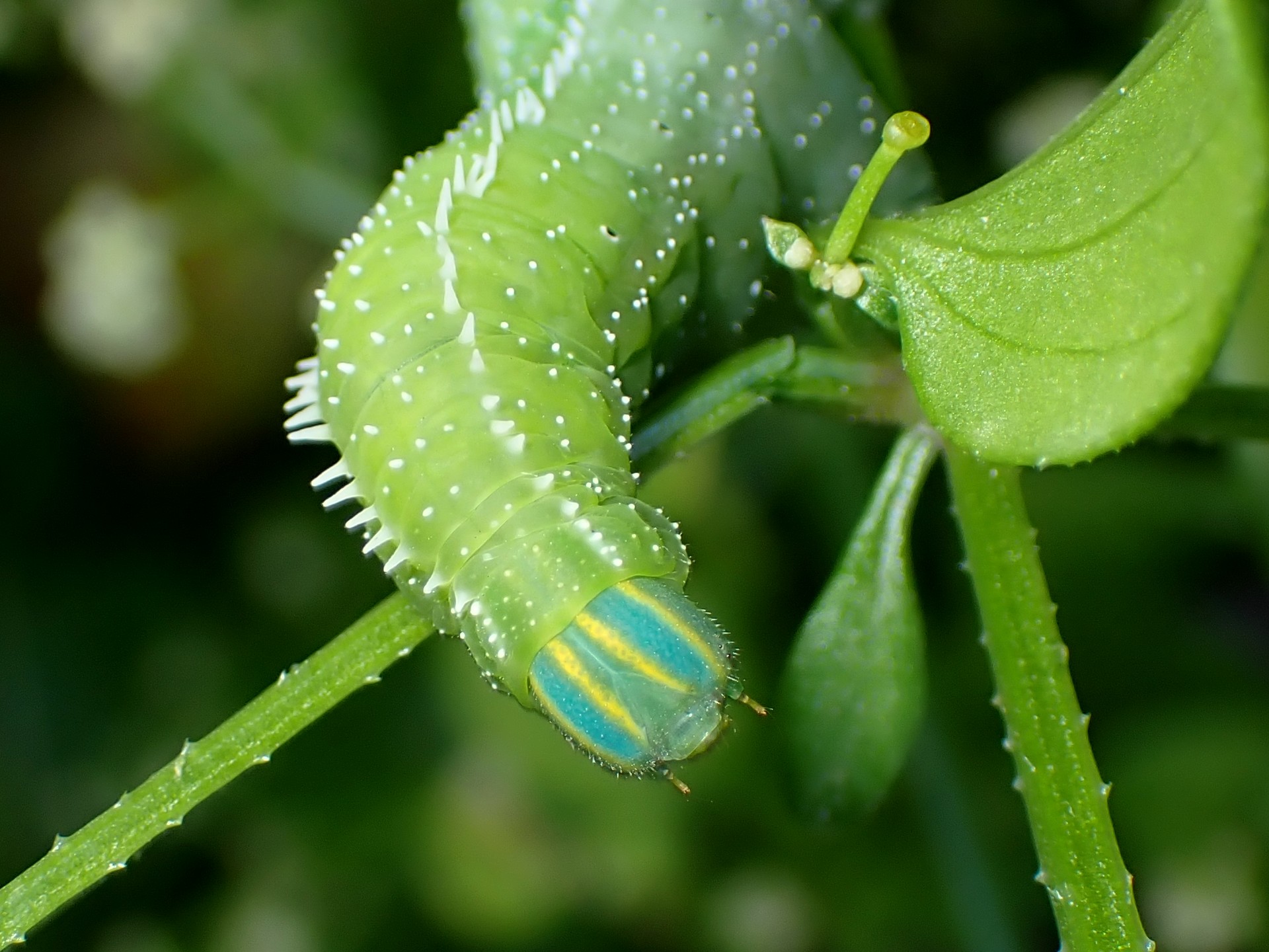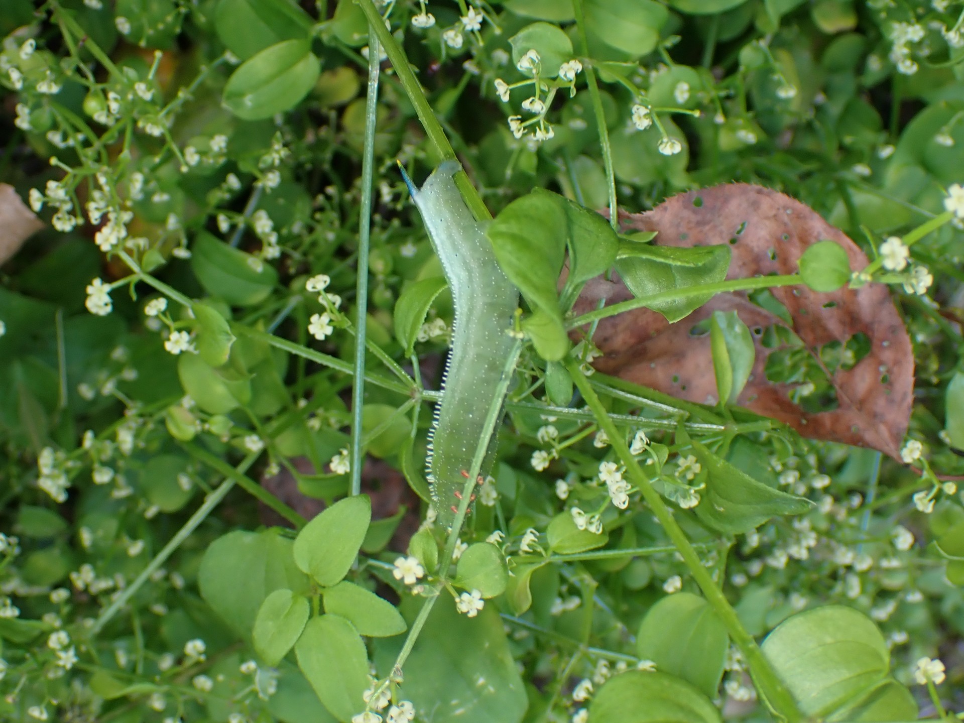 [ホバリングしながら蜜を吸うスズメガ]の幼虫です。黄色のラインがタートルネック越しにわずかに見えるシースルーがオシャレです。