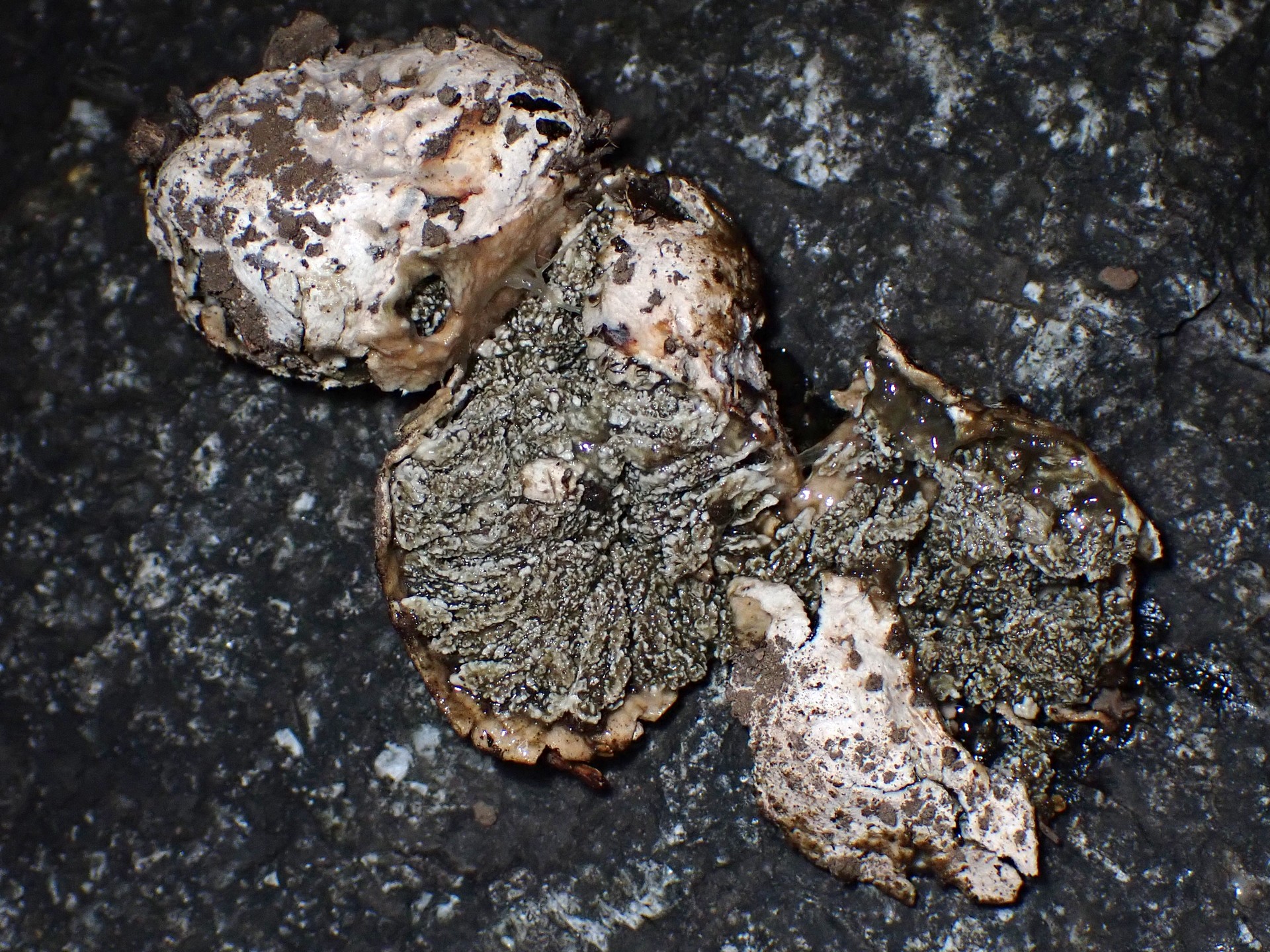 外見がそっくりな[ジャガイモタケ]と見分け方は、断面の差異とのこと。
