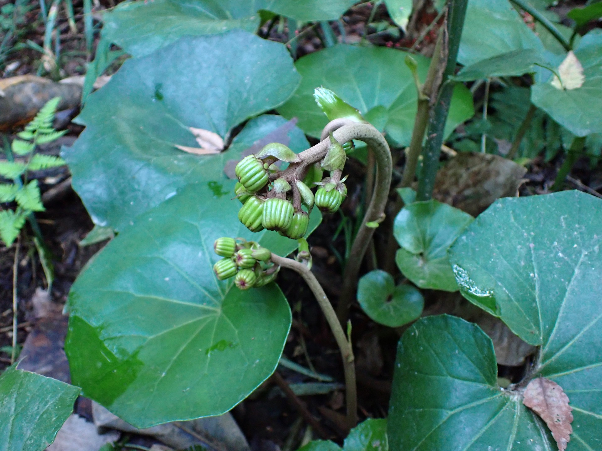 葉の形から、黄色の花が咲くツワブキと判断しました。