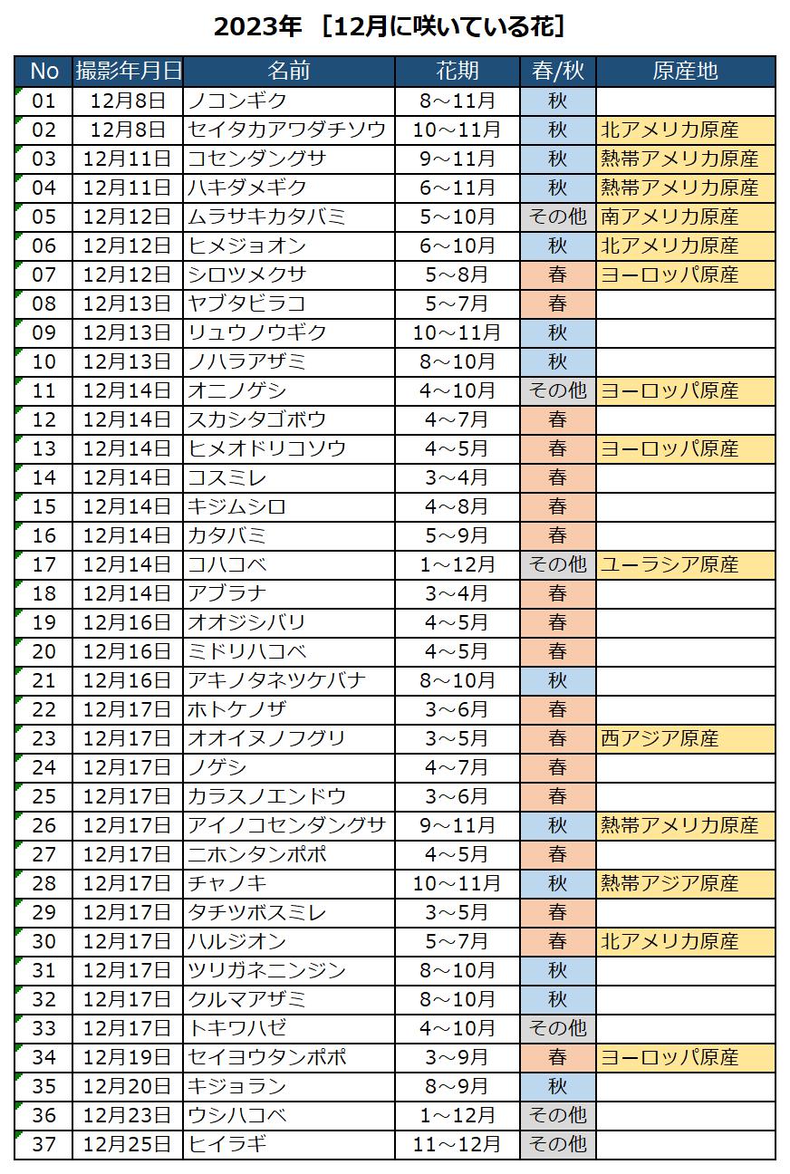 横浜市 青葉区 寺家ふるさと村で 12月に撮影した花の一覧表を作りました。